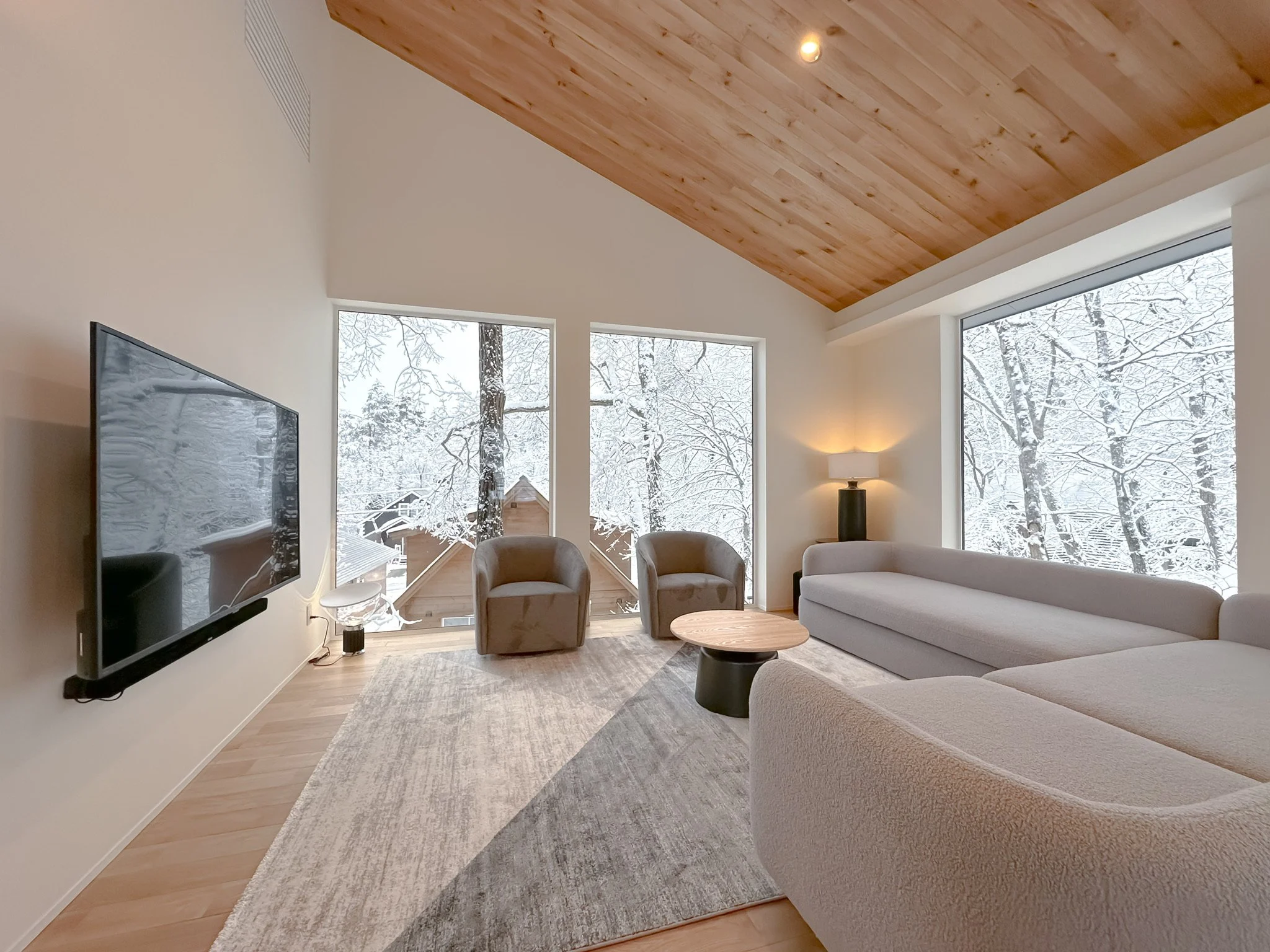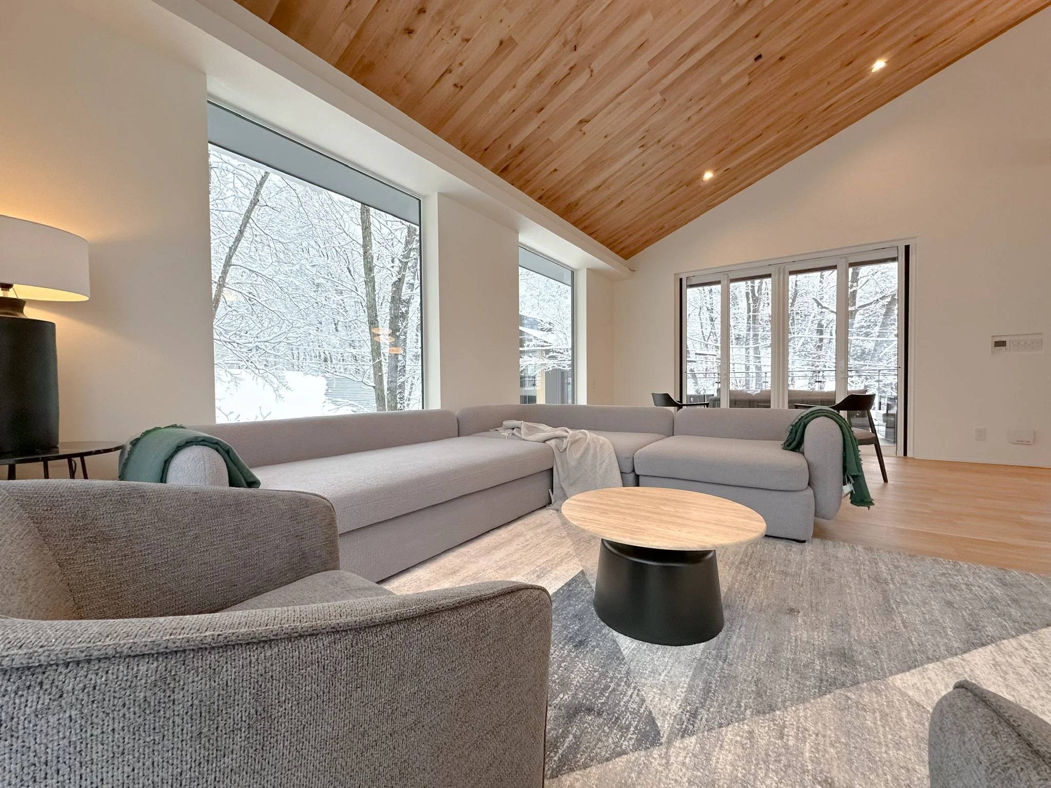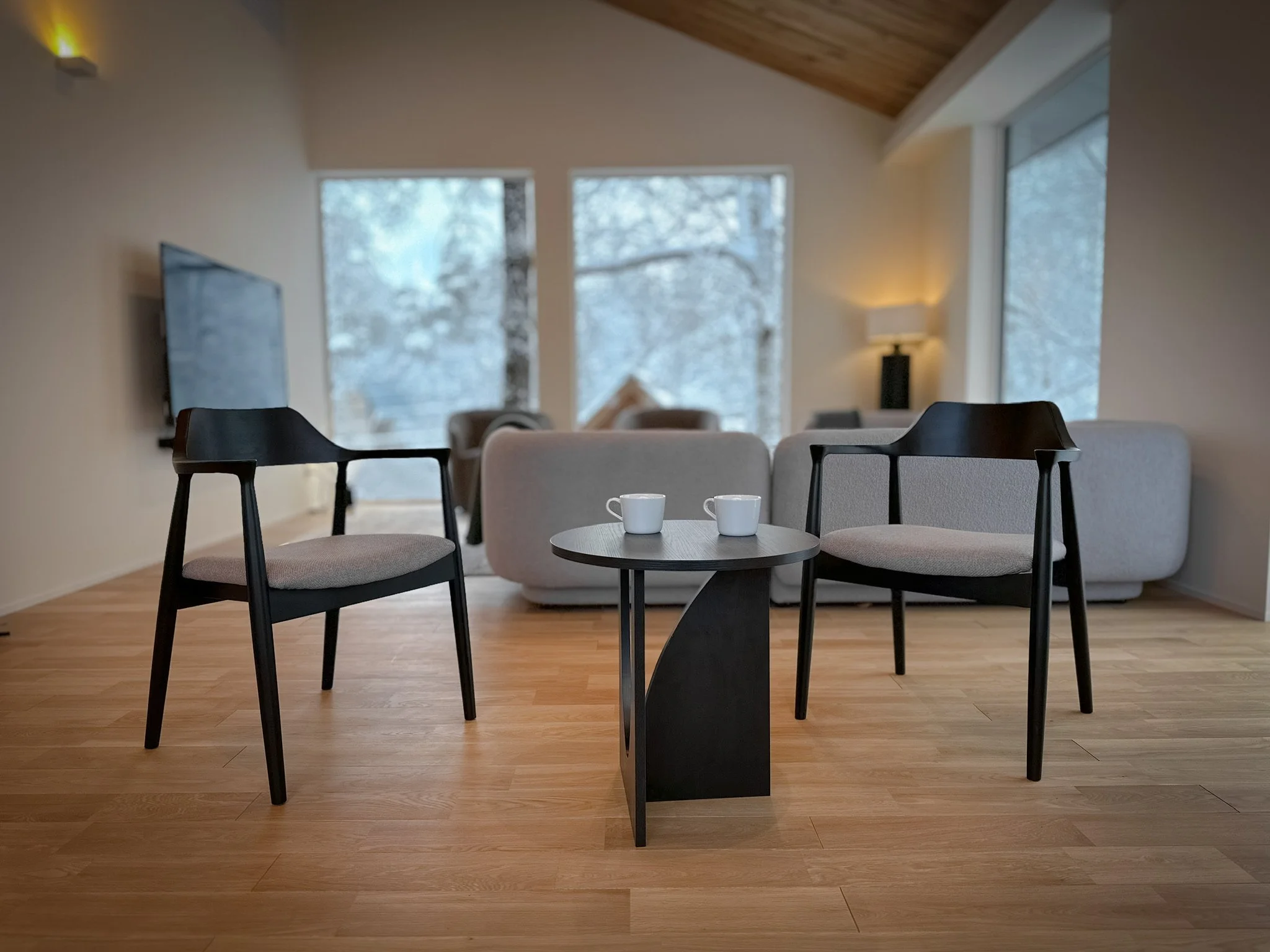The heart of Chalet Hikaru is its expansive open-plan living space, designed to showcase stunning mountain views. Bathed in natural light, it creates a warm and inviting atmosphere throughout the day. Equipped with immersive sound systems and thoughtfully designed Japanese–Scandinavian interiors, the living area is the perfect setting for both lively gatherings and quiet moments of relaxation.