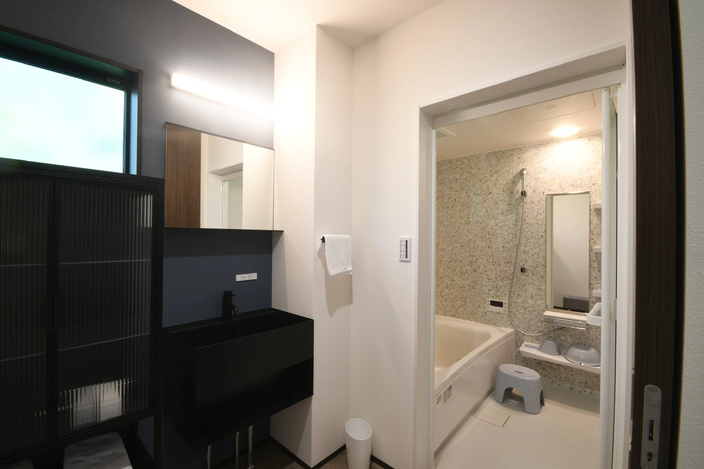 The bathroom, on the lower floor next to the bedrooms, has a bath, shower, and vanity sink. There is a separate toilet next to it, as well as an additional toilet on the upper floor.