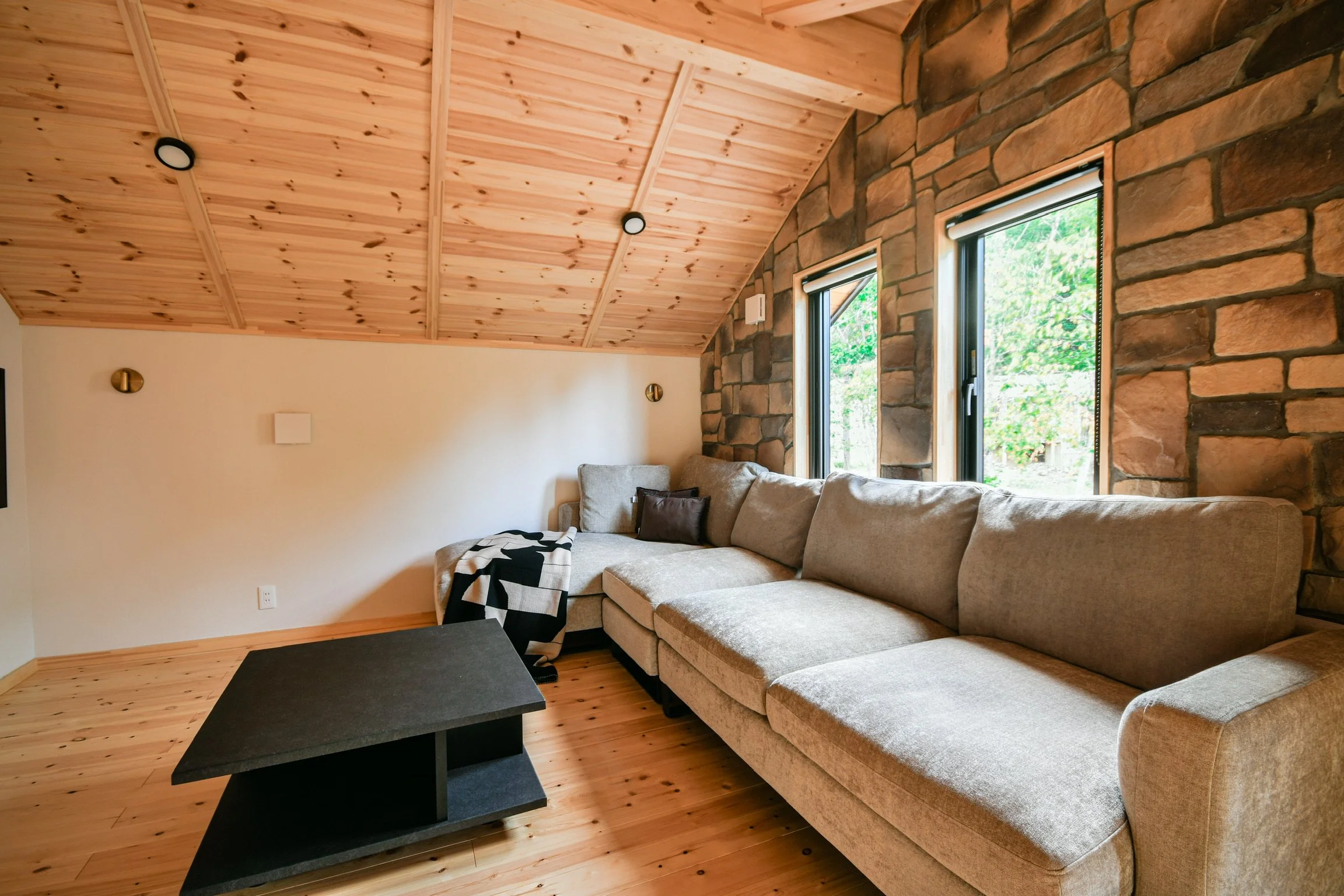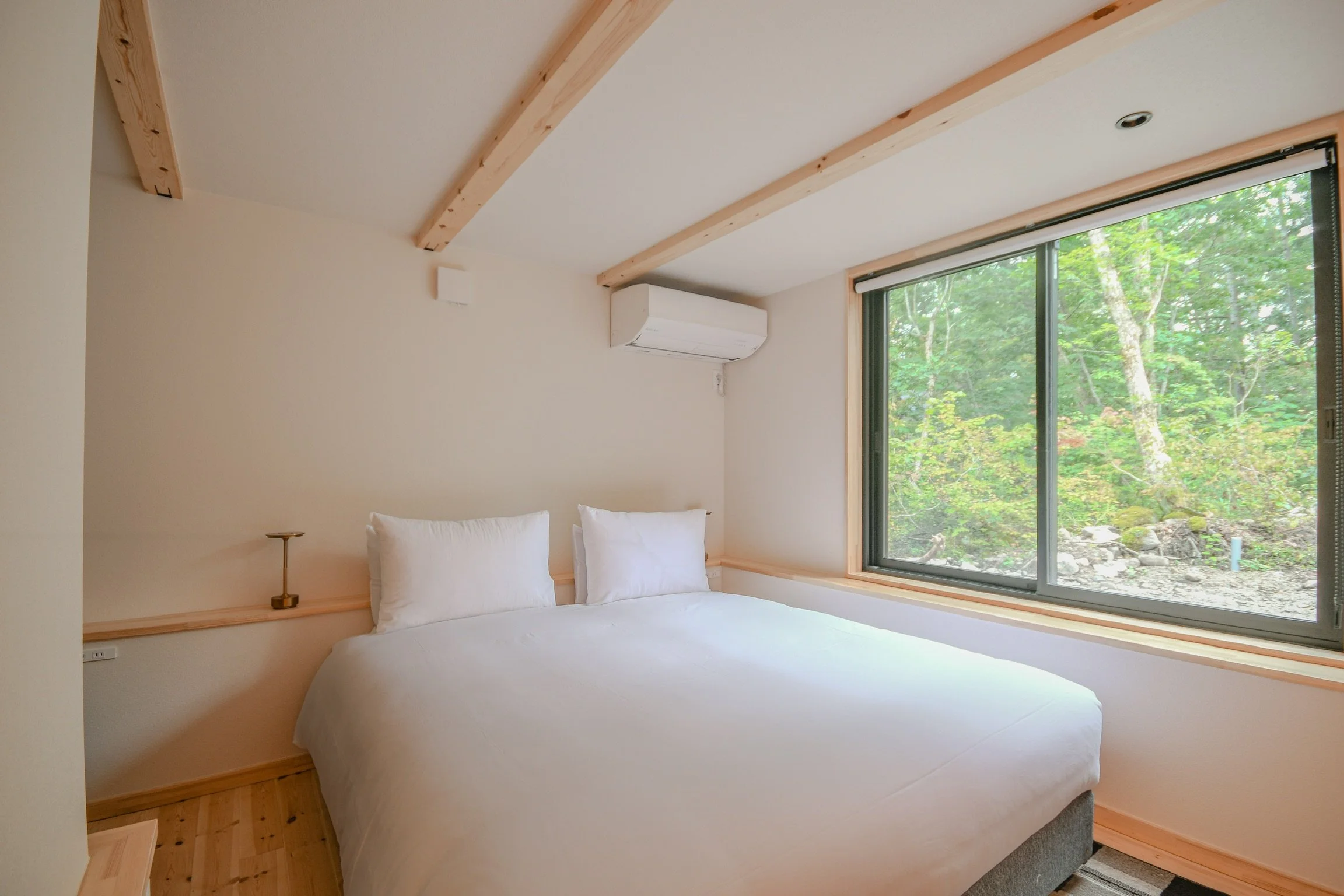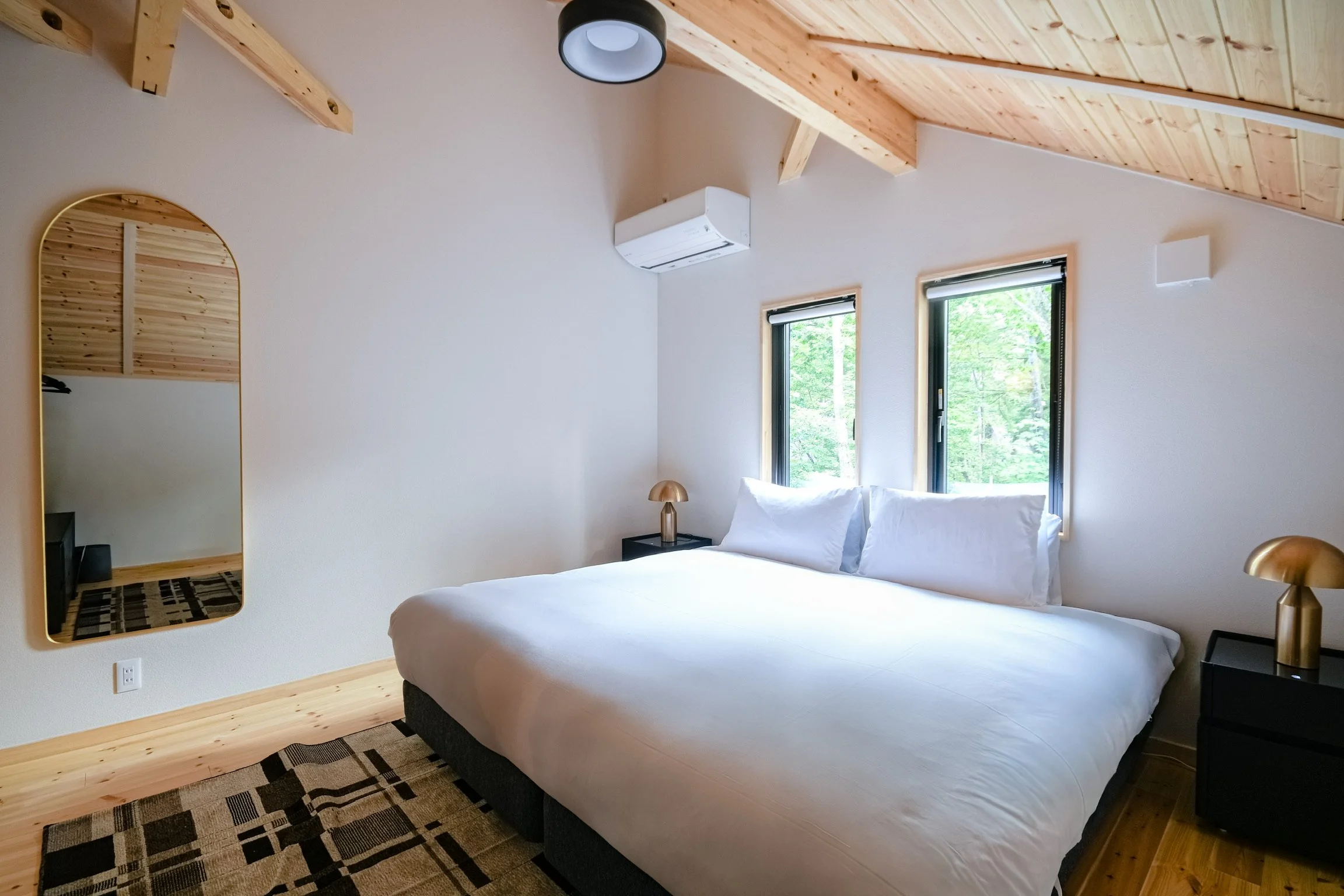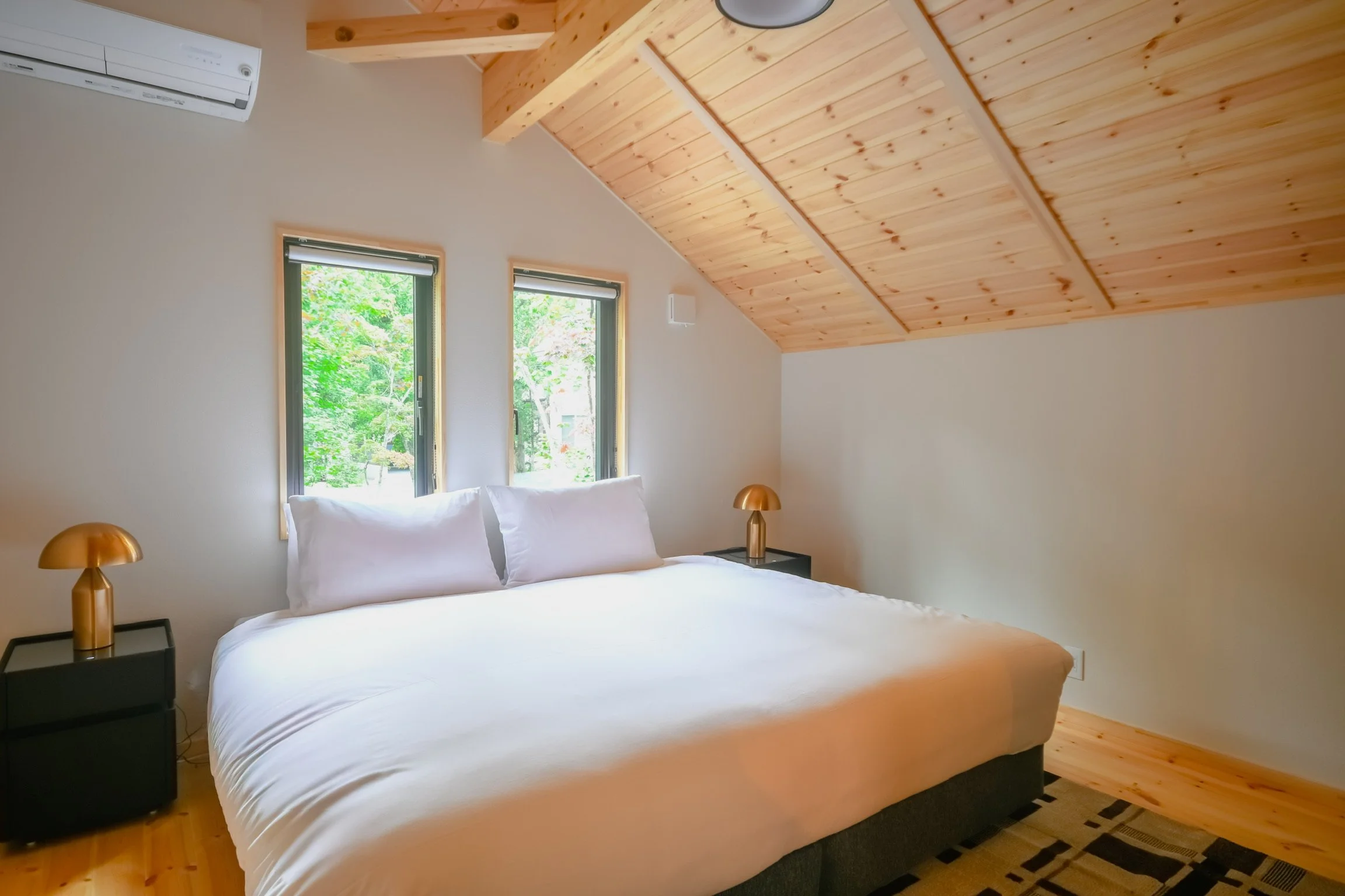 Serene features three bedrooms in total — two on the lower floor, and one on the upper floor — sleeping up to 6 people in comfort.