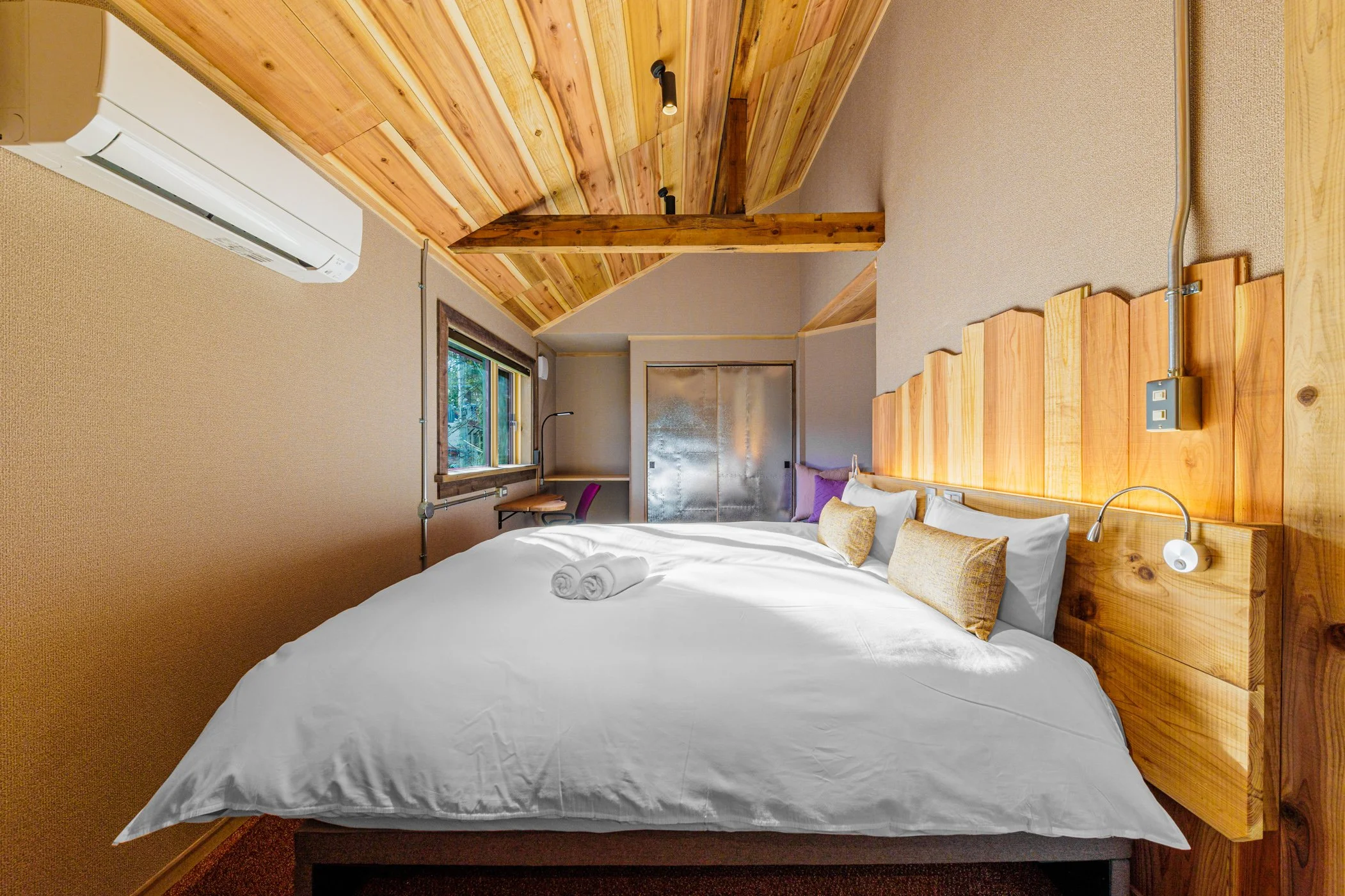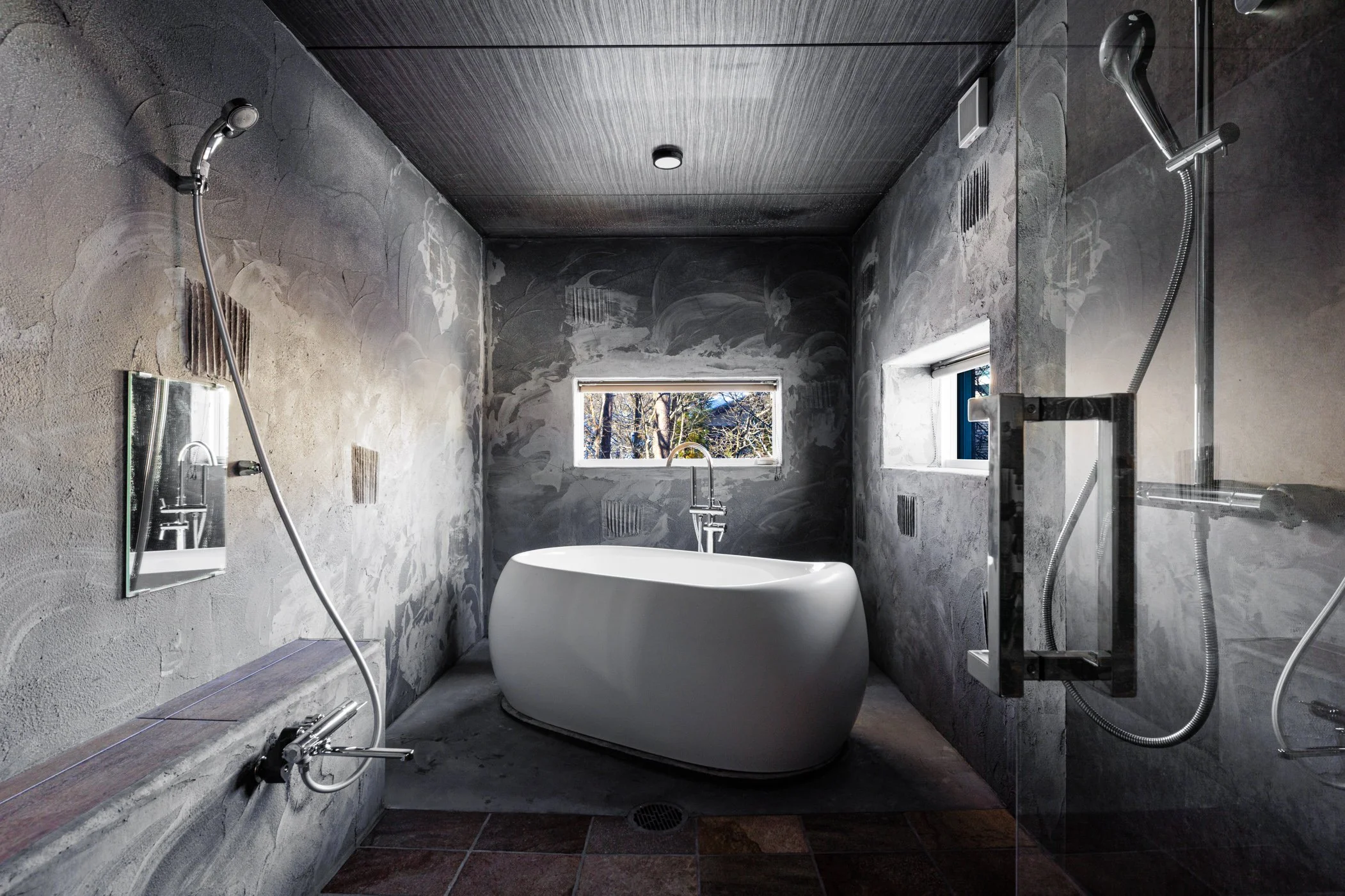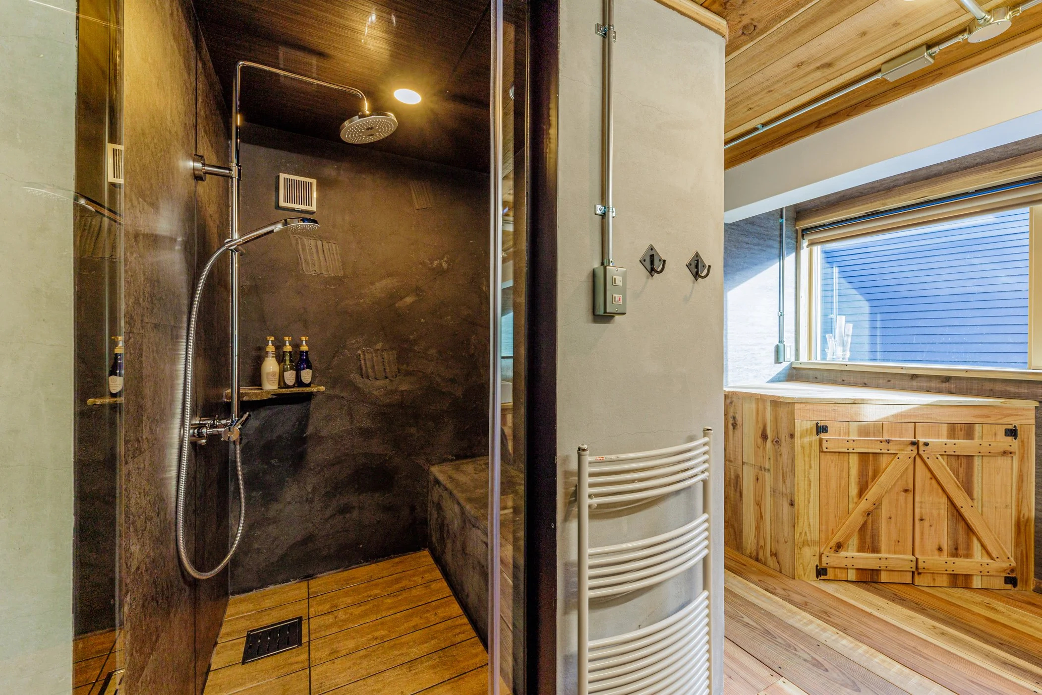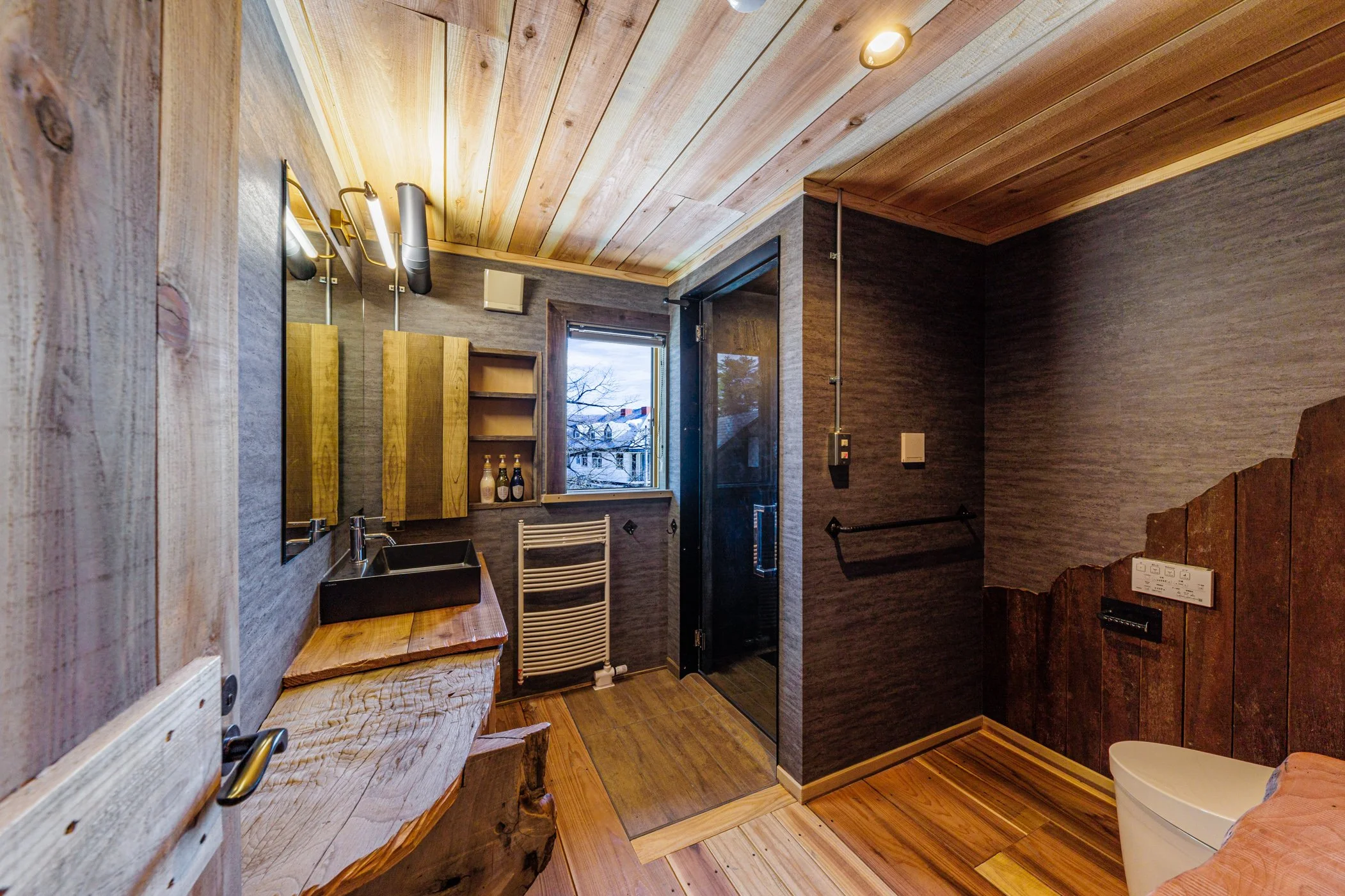 The principal bedroom on the ground floor has an ensuite bathroom with a bath, shower, vanity sinks, and a toilet. Enjoy jaw-dropping views of the Japan Alps while soaking in the bath. The second bedroom on the lower floor also has an ensuite shower room.